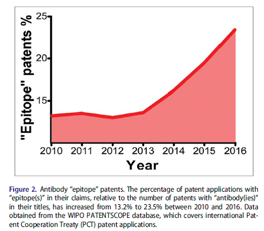 Due to the evolution of technology in antibody-related inventions antibody-related field, it has been observed that the claims of the patent applications for such inventions change from defining the claimed antibody by the hybridoma producing the monoclonal antibody with the hybridoma deposited with a domestic depository institute designated by the Specific Patent Agency to defining the claimed antibody by the variable region sequences of the heavy/light chains of the antibody. In recent years, an increasing number of patent applications covering antibody-related inventions have the claimed antibodies defined by epitopes recognized by the antibodies (see the figure below).