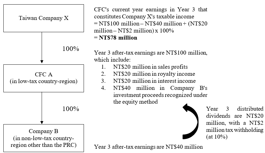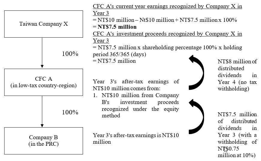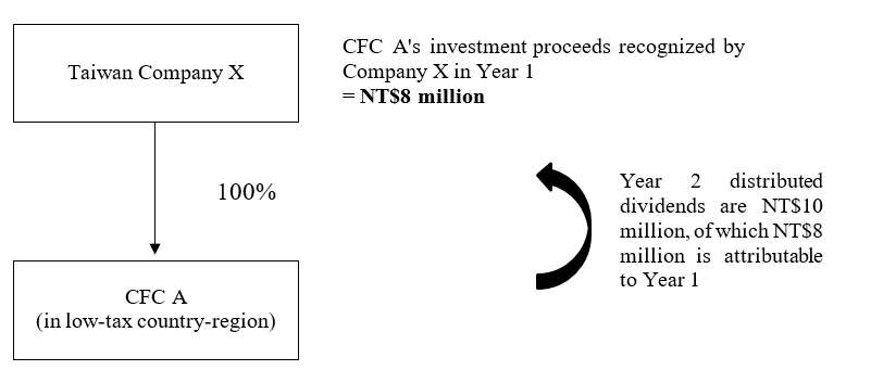 For instance, Taiwan Company X owns 100% of Company A (Taiwan Company X's CFC located in a low-tax country). In Year 1, pursuant to Article 43(3) of the Income Tax Act, Taiwan Company X includes the investment proceeds (which come to a total of NT$8 million) from Company A's CFC into its taxable income. In Year 2, Company A distributed of NT$10 million of dividends (of which NT$8 million was earnings in Year 1), and Taiwan Company X was distributed NT$10 million of the dividends, of which NT$8 million was already recognized as CFC investment proceeds for tax purposes in Year 1 and therefore was not repeatedly included in the taxable income in the year of the distribution (i.e., Year 2). The remaining NT$2 million should be included in the taxable income in the year of the distribution (i.e., Year 2).