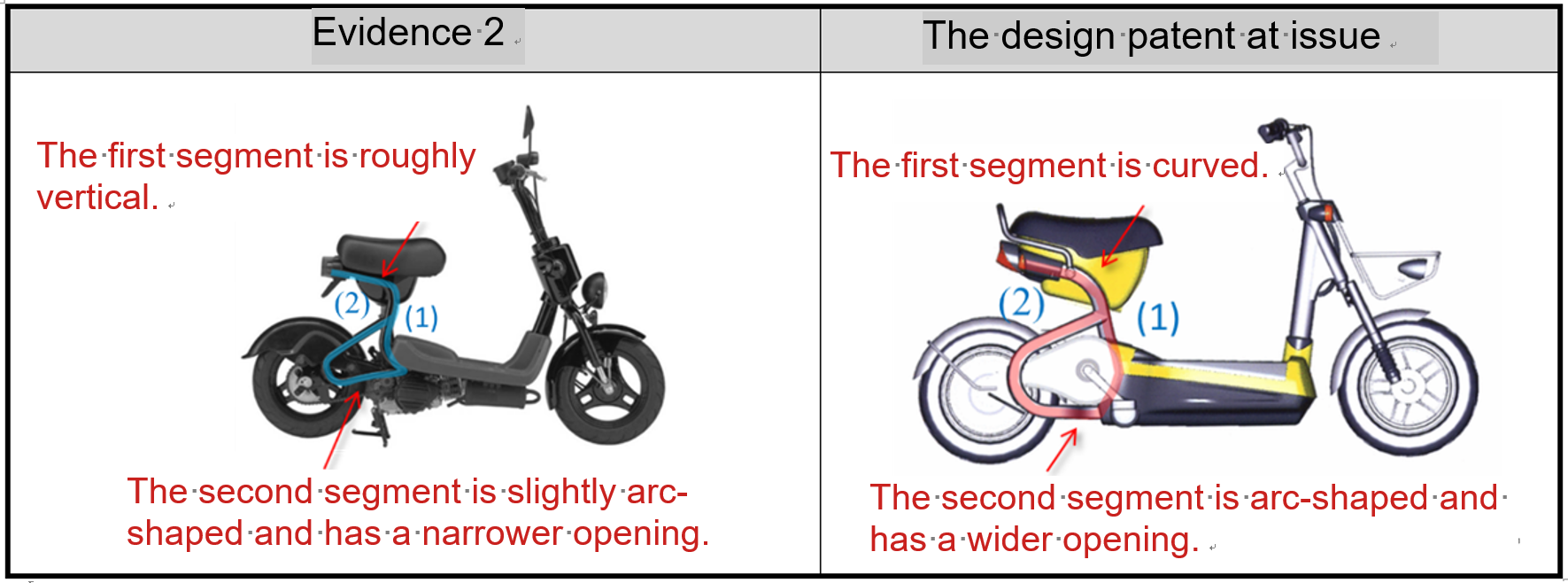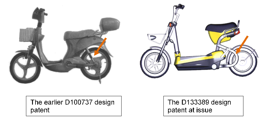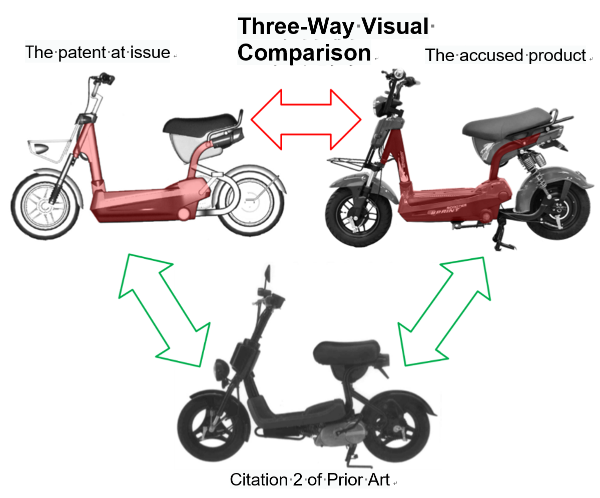 Both the first and second tribunals in this case generally considered that the patent at issue and the accused infringing product (the product at issue) were identical or similar in appearance of the front end, the pedaling part (together with the X-shaped pattern thereon), the seat cushion, the storage compartment, the seat post, etc., which belong the main body of the bike. However, the first tribunal held that the design patent at issue and the accused infringing product were neither identical nor similar to each other in the overall appearance because the inverted U-shaped rear fork rack provides the seat cushion and the storage box with a "suspended" visual impression, which is obviously not identical to the shape of the shock absorber and rear fork rack of the product at issue. In addition, the design at issue and the accused product have different designs in "handlebar," "headlight" and "basket," which are essential parts frequently used and easily noticed by an ordinary consumer. The second tribunal, on the other hand, held that there is slight difference between the tilt angle of the shock absorber of the accused product and the upper end of the inverted U-shaped rear fork rack of the patent at issue. Also, the shock absorber of the accused product is installed out of the need of shock absorption and has long been seen in prior art (Evidence 3). The second tribunal further held that the design of the "frame" determines the salient features of the motorcycle model and thus is the core of the design. In addition, the common features of the accused product and the patent at issue reside in the main frame and the seat cushion which take up a large visual area and are readily visible in normal use and thus are sufficient to affect the overall visual impression of an ordinary consumer. The different features mainly reside at the front and rear end portions, which scatter and take up a smaller part of the overall visual area and thus do not affect the overall visual impression. Hence the second tribunal held that the patent infringement was established.