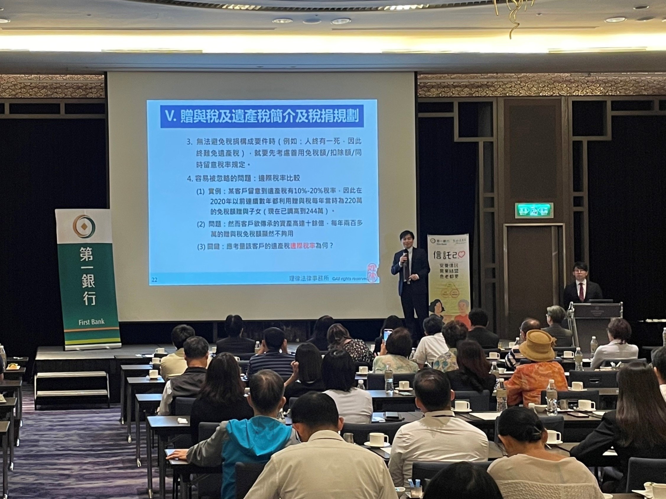 理律與第一銀行共同於台北喜來登酒店及台中林酒店主辦「傳承信託研討會」,由林恆鋒合夥律師及陳敬宏初級合夥律師以實務經驗分享各種家族傳承工具的特色與優缺點,深入淺出,使與會來賓輕鬆了解包括信託在內傳承工具之特有功能,有助選擇最適合自己家族的傳承方式。