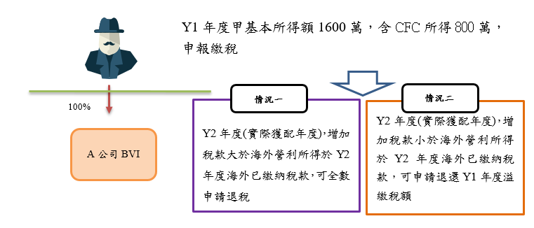 假設個人甲持有國外A公司100%股權,A公司為甲之CFC,Y1年度甲依所得基本稅額條例第12條之1計算A公司之營利所得800萬元,併計當年度基本所得額,A公司於Y2年度決定發放股利800萬元,繳納稅款80萬元並取具當地稅務機關發給之納稅憑證。
