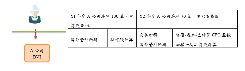 舉例說明如下:劉君持有國外之A公司80%股份(計1,000股、每股成本1,000元),A公司為劉君之CFC,A公司之Y1年度盈餘100萬元;劉君於Y2年7月1日出售100股,每股售價5,000元,A公司之Y2年度盈餘70萬元,劉君計算其Y1年度及Y2年度之海外營利所得及交易損益如下: